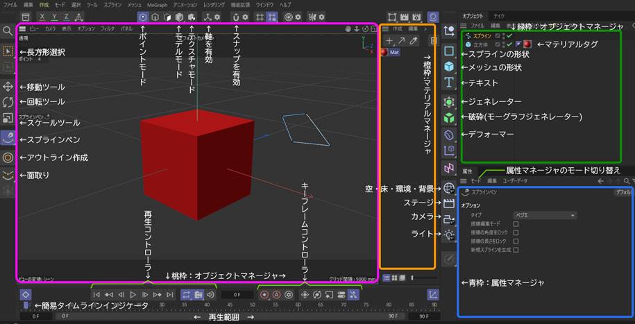 スプラインペンの色を変えたからといって、立体物の色が変わるわけではありません。そうではなくて、スプラインペンで線を引いて物体を作っているときに、非選択にするとスプラインの色が黒になってしまい、背景が暗いとそれに溶け込んで見えにくくなります。こうなると作業がやりにくくて苦労します。
