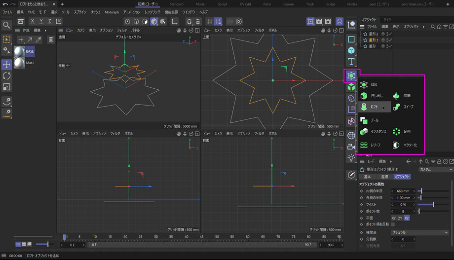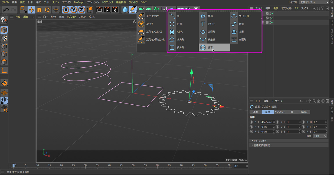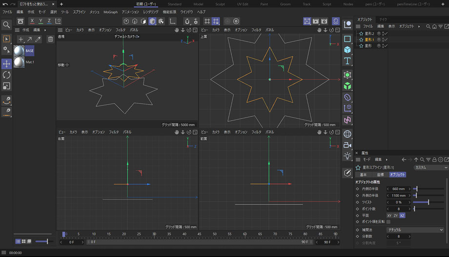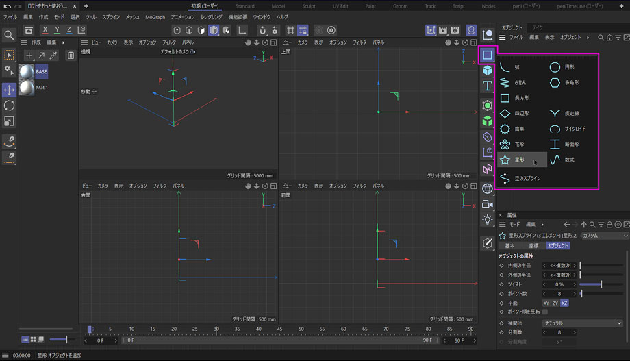 まずはひねり出したクリームの原型となる星形を作ります。これも超簡単、スプラインプリミティブ(R22までは単にスプラインオブジェクトと呼ばれていました)から『星形』を選びます。