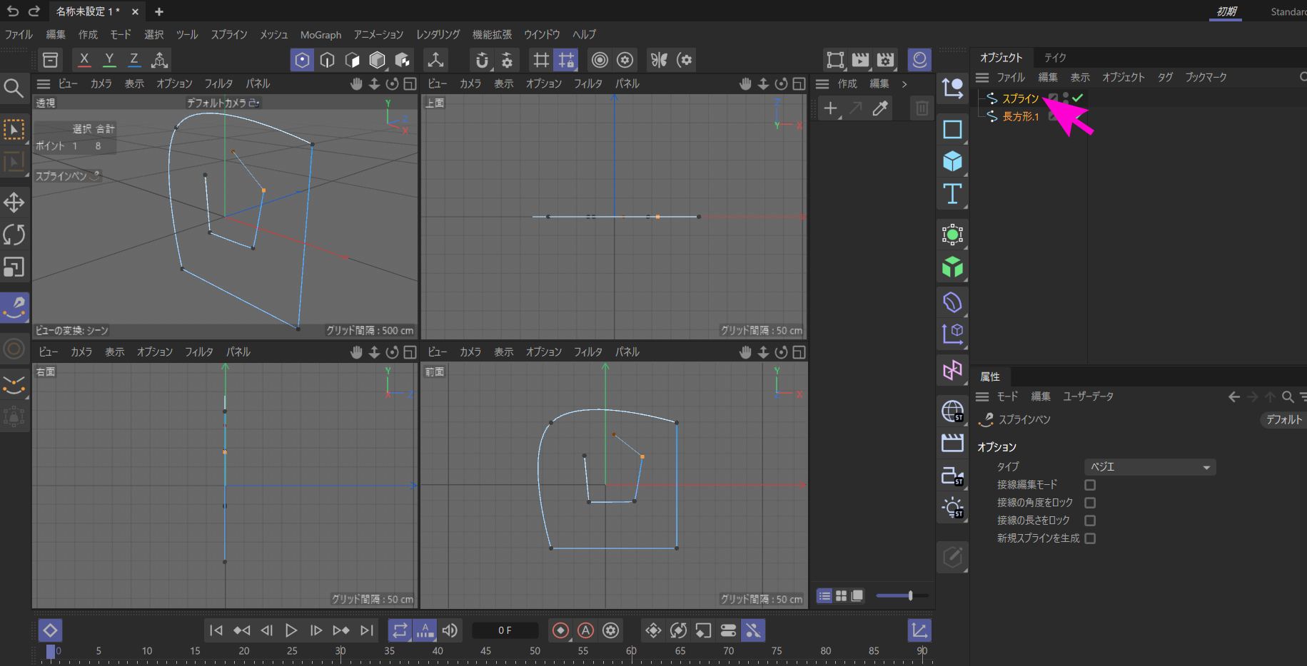 スプラインペンで編集することもできる汎用性の高いオブジェクトです。編集可能にすると、長方形のスプラインオブジェクトから台形とか、任意の形に変えることができます。