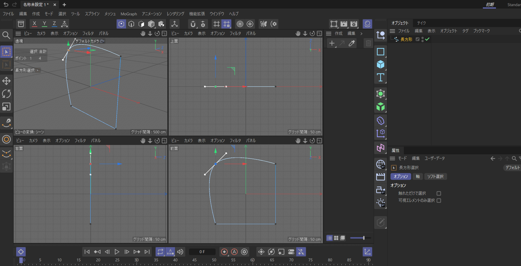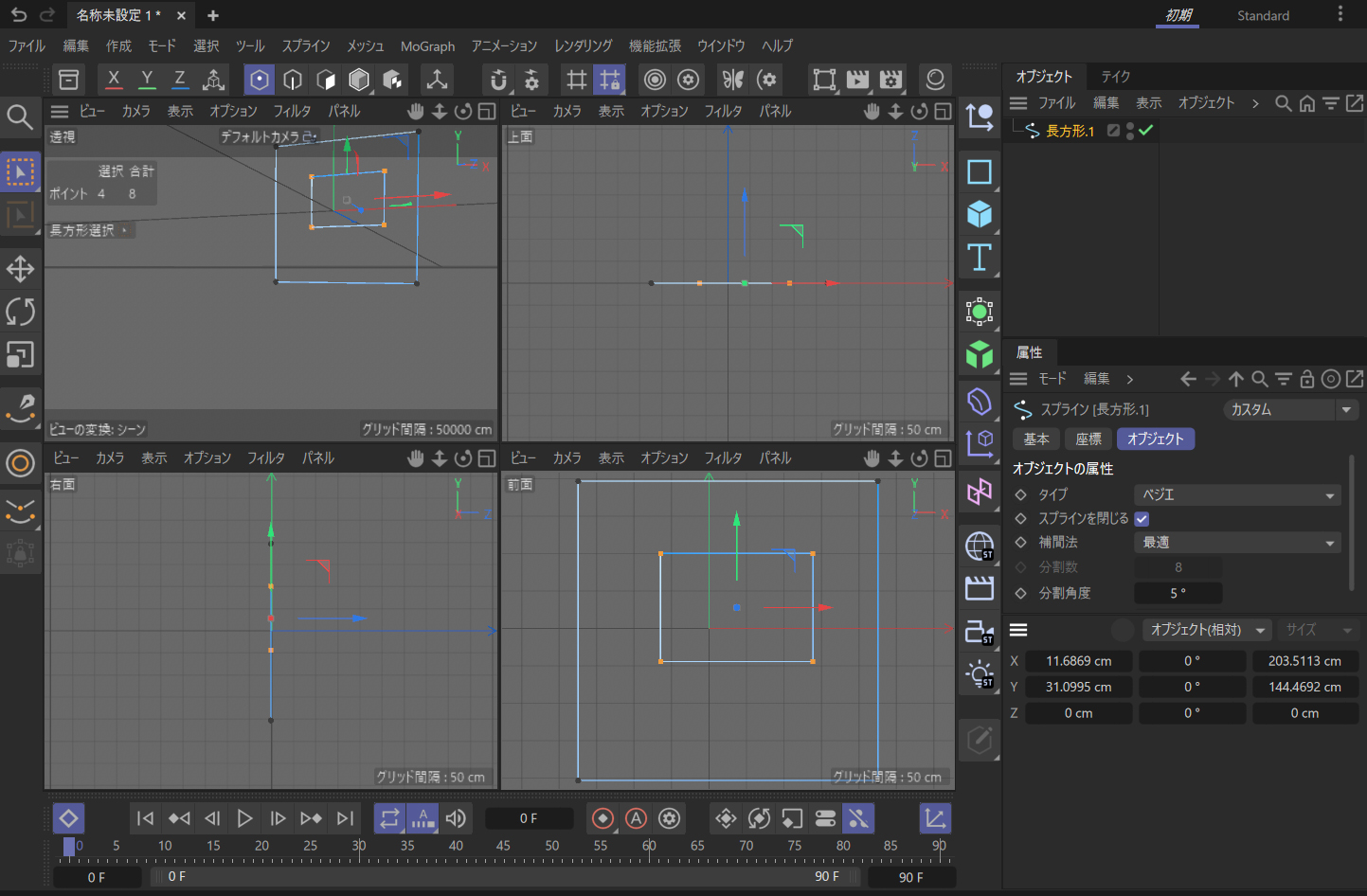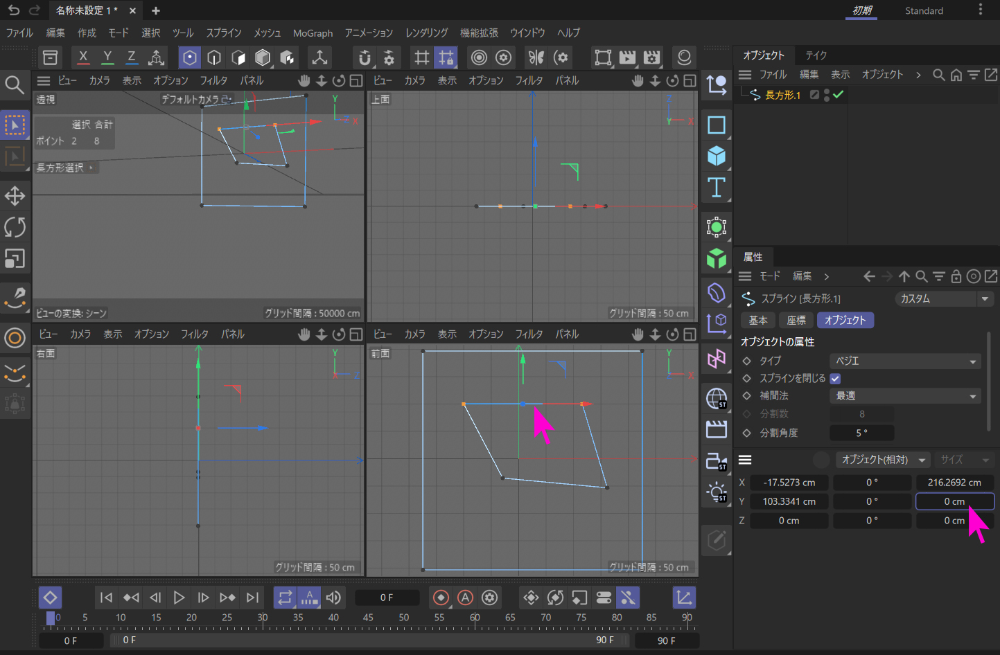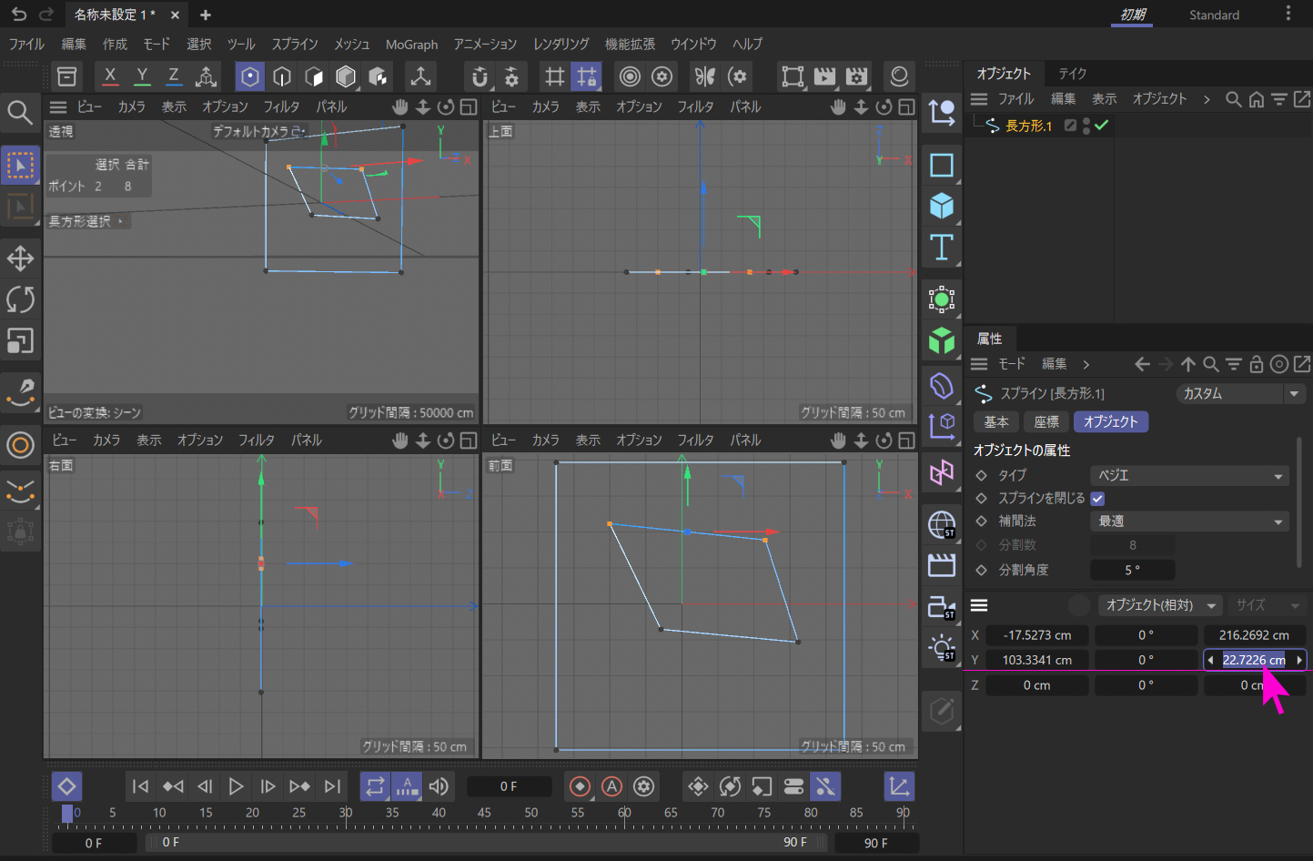 まず、プリミティブスプラインオブジェクトで四辺形を選んで、属性マネージャの【オブジェクト】パネルで、作ろうとする平面のサイズに幅と高さを合わせます。