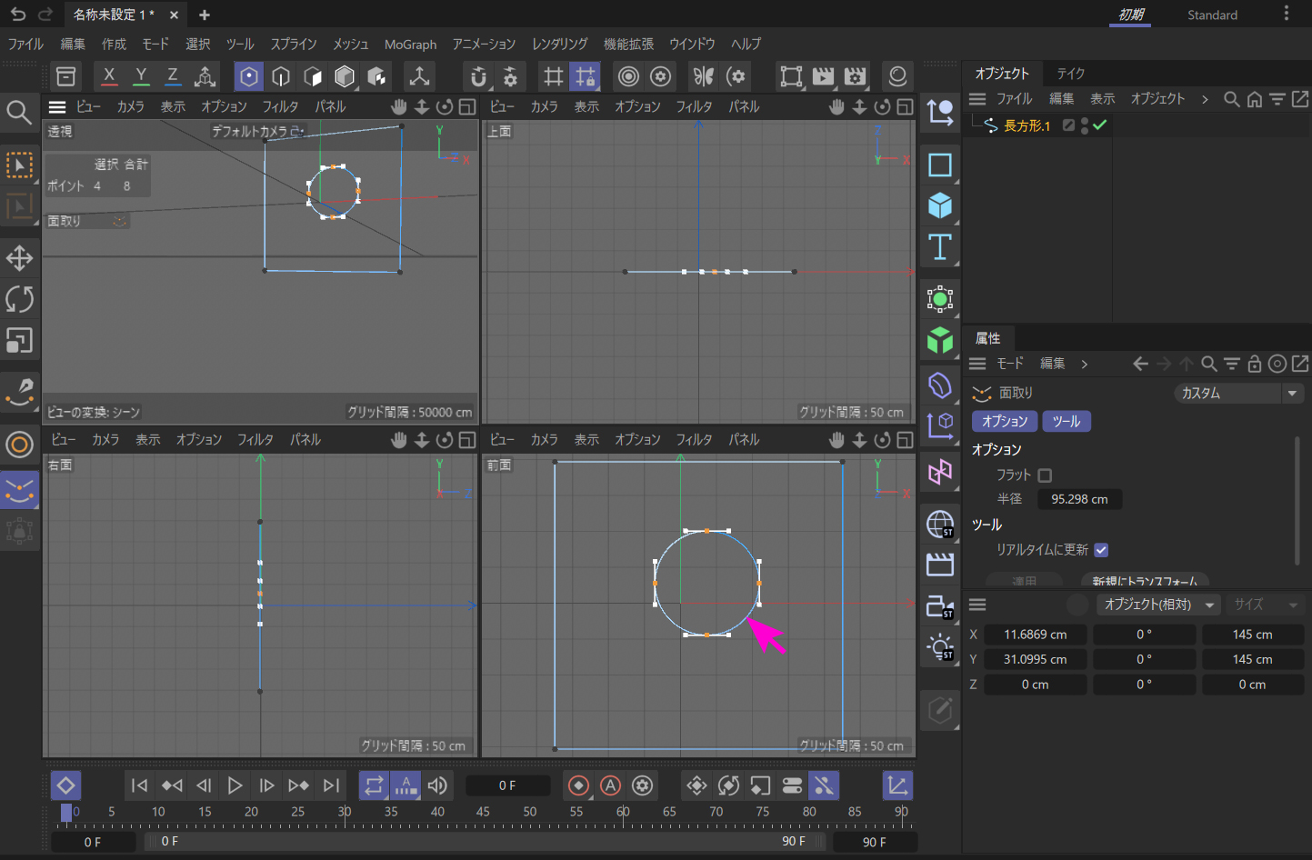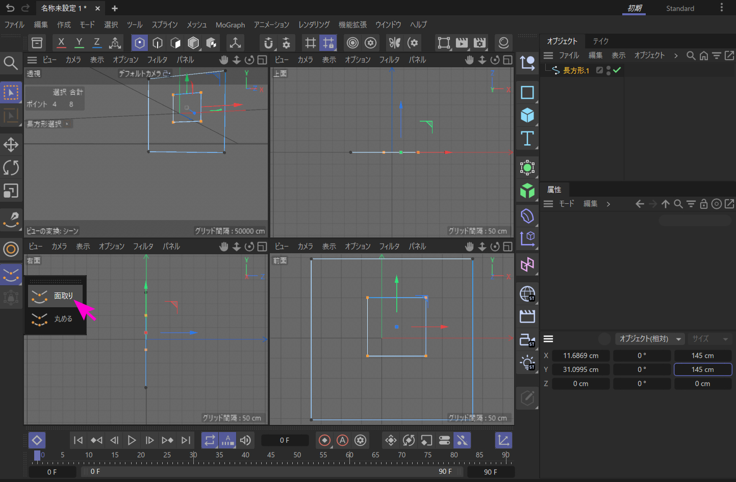 上の写真が選んだ直後です。そして属性マネージャの下にあるのが座標マネージャで、選択したポイントの座標(左端のX,Y,Z)とサイズ(右端のX,Y,Z)の値が表示されています。座標マネージャが出ていない場合は、【ウィンドウ】→【座標マネージャ】の順に押します。