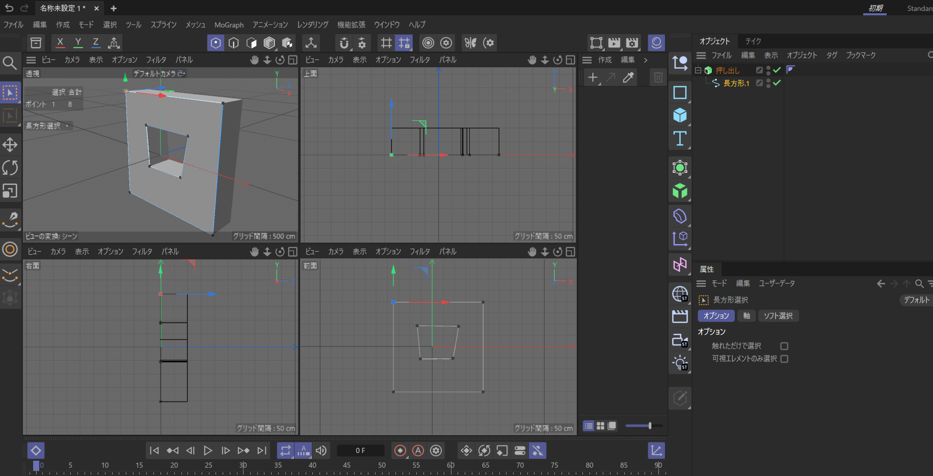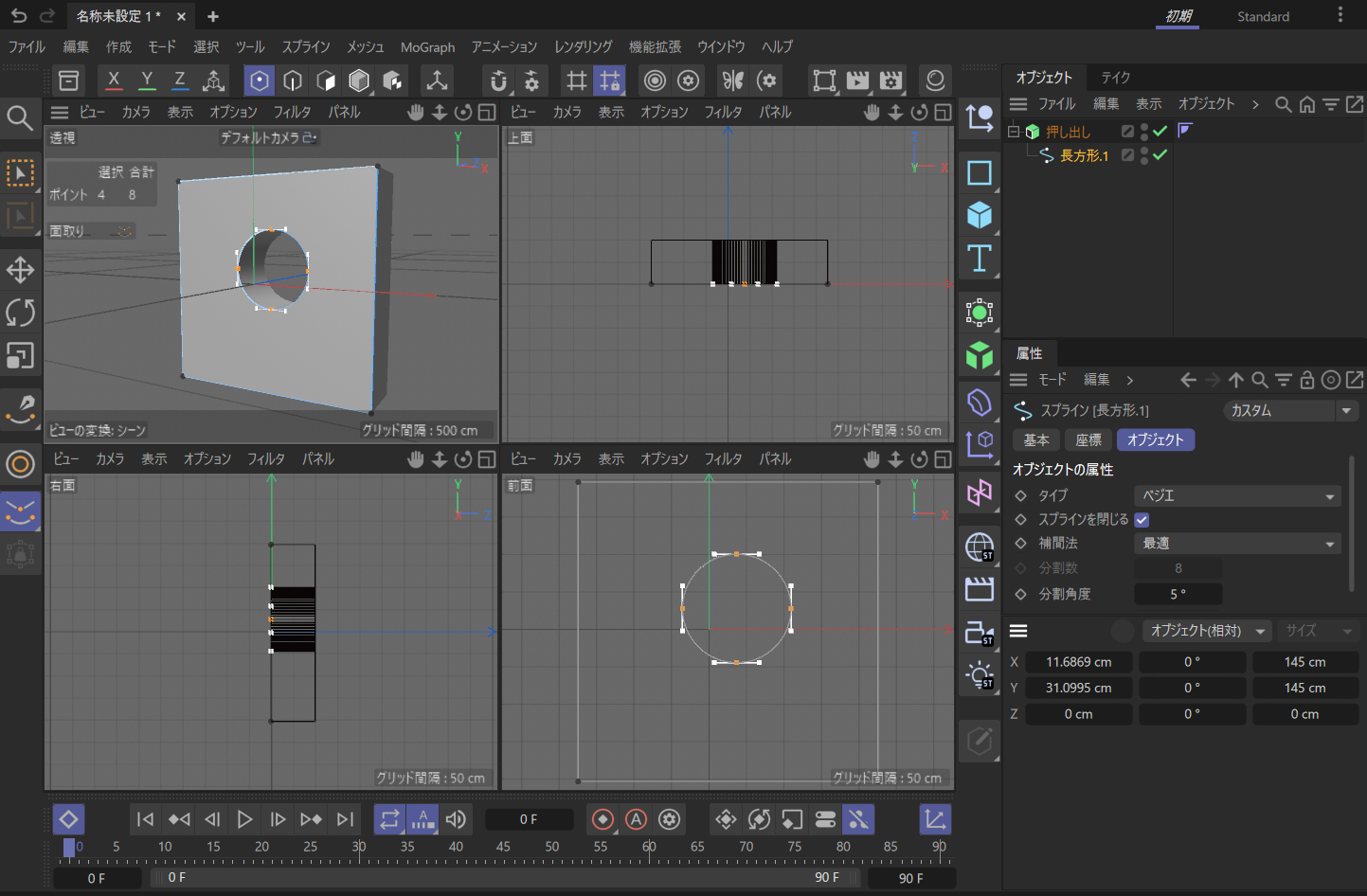 自分でパスを打ってクローズドパスにしたスプラインなら、すべてがハード補間でも穴を開けることができますが、なぜか、プリミティブスプラインオブジェクト(四角形や円形などのスプラインオブジェクトがワンタッチでできるツール。AEでいうところの長方形ツールで四辺形を作ったのと同じ)で、四辺形を作ったときは穴が開きません。