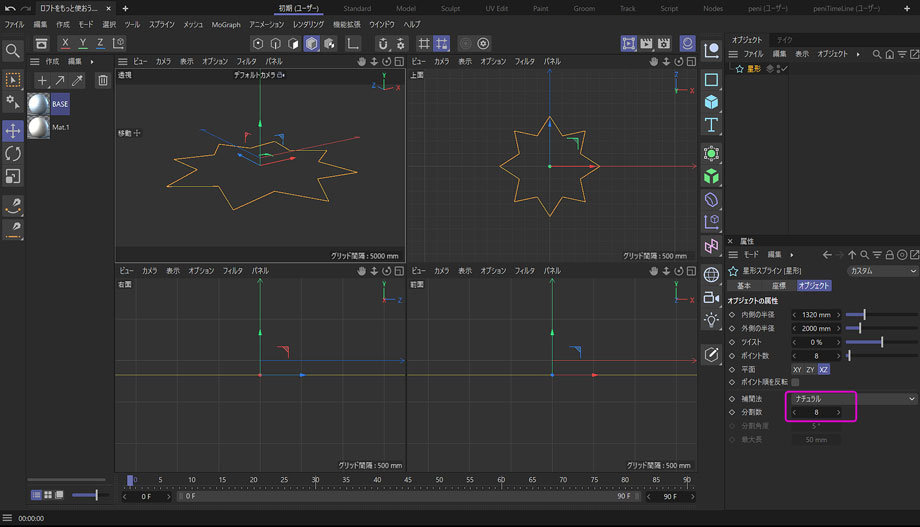 【平面】は『XZ』【補間法】を『ナチュラル』【分割数】を『8』ぐらいにします。スプラインで、より滑らかなオブジェクトを作るときは、【補間法】を『ナチュラル』【分割数】を『8』以上にしています。ただし『32』を超えると超重くなってきますのでほどほどに。