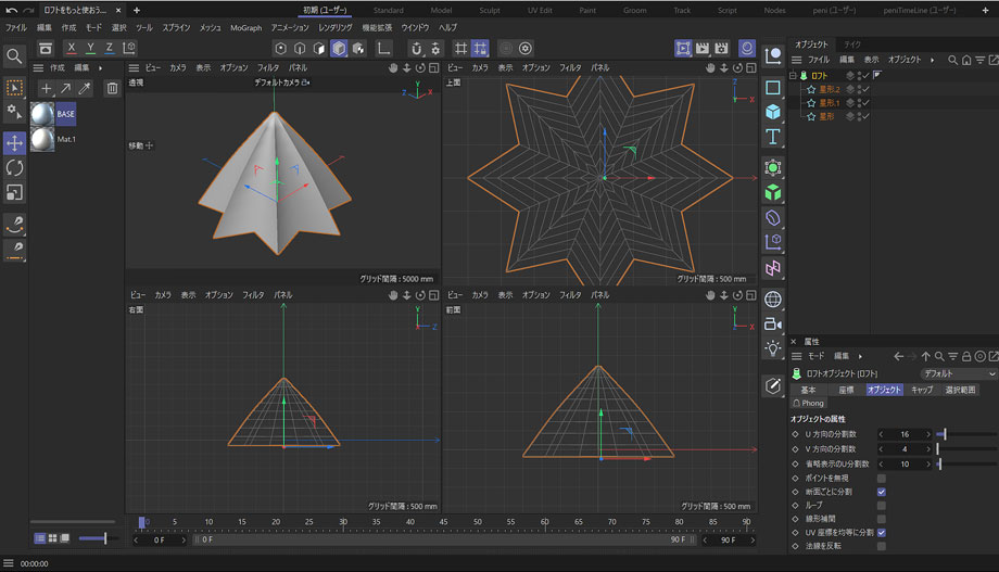 ロフトでどうやってひねらせるか、もうお分りでしょう。3段になった星形オブジェクトを徐々に Y軸回転させていけばそのあいだを C4d Lが補完してくれます。