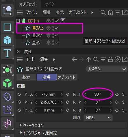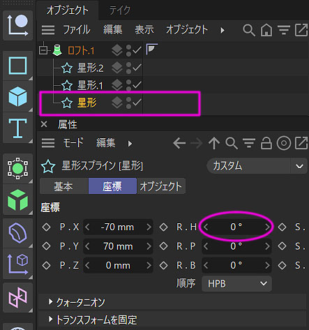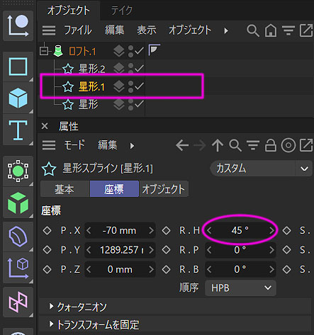 ロフトの子階層(星形オブジェクトが並ぶ階層)にデフォーマの【ツイスト】をかけてもひねりができますが、ひねり始めから終わりまで同じ調子でひねられますので、細かくこだわるのなら、このままロフト内でひねりも作ります。
