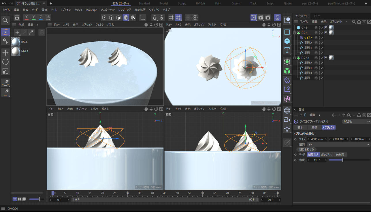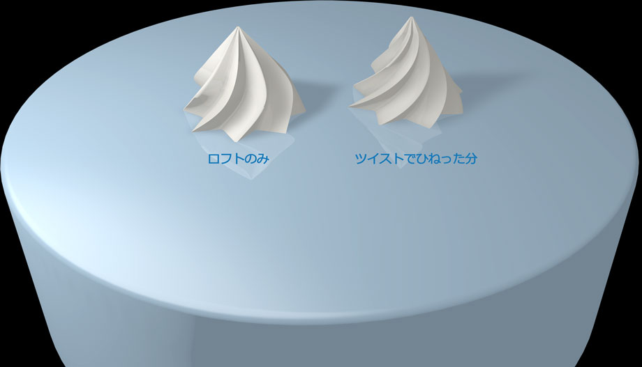 生クリームのひねったデコレーションが二つありますが、左にあるのが、いま作ったロフトの中間層を 3段から 4段に増やして、回転値を調整しつつ徐々にひねったもので、右は【デフォーマ】の【ツイスト】でひねったものです。どちらもきれいにひねられていますが、ツイストのほうは均等にひねられているのが分かります。どちらがよいのかは使用される状況によって異なりますので、ケースバイケースでいいのではないでしょうか。