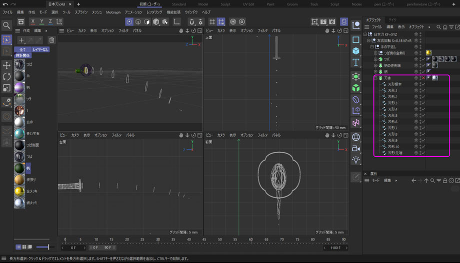 次の例は、【ロフト】を使って日本刀の刃を作ろうとしているシーンです。