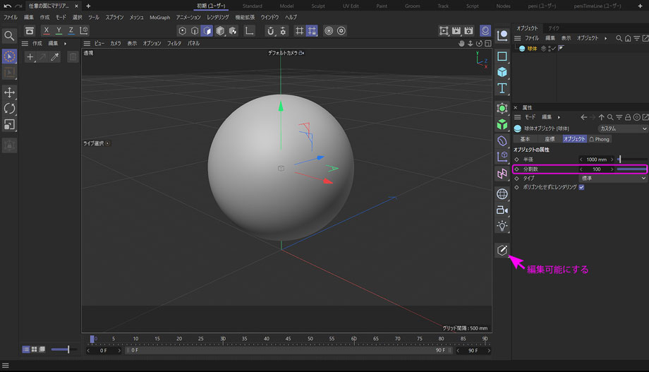 で、ポリゴン化する前に選択する面をどこまで細分化するべきかを考えて分割数を調整します。属性マネージャの【オブジェクト】欄にある分割数は最大 1000まで分割できますが、その分パソコンが重くなりますし、ポリゴンの選択が大変になりますので、ここは適度にしておきます。