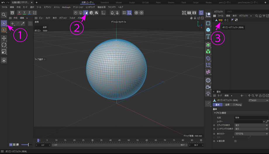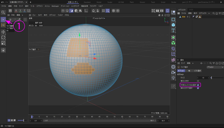 次の写真は、球体の分割数を『100』にした直後の写真です。この球体を例に説明します。