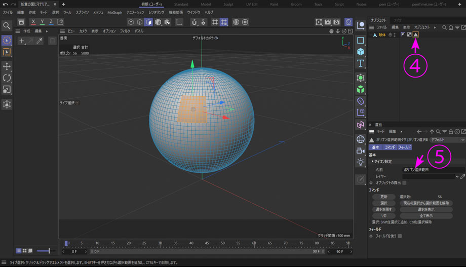 選択範囲が記録されると、④の場所にタグが貼られます。そのタグの属性が⑤の場所に表示されます。⑤はそのタグの名前で、ここは任意に変更可能で、またこの名前が面を指定するときに利用されます。その前に、選択範囲の追加や削除の説明をします。