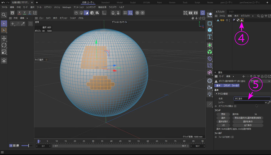 これで ④のタグは『赤に塗る』と名前が付いた選択範囲、つまり指定の面になったわけです。