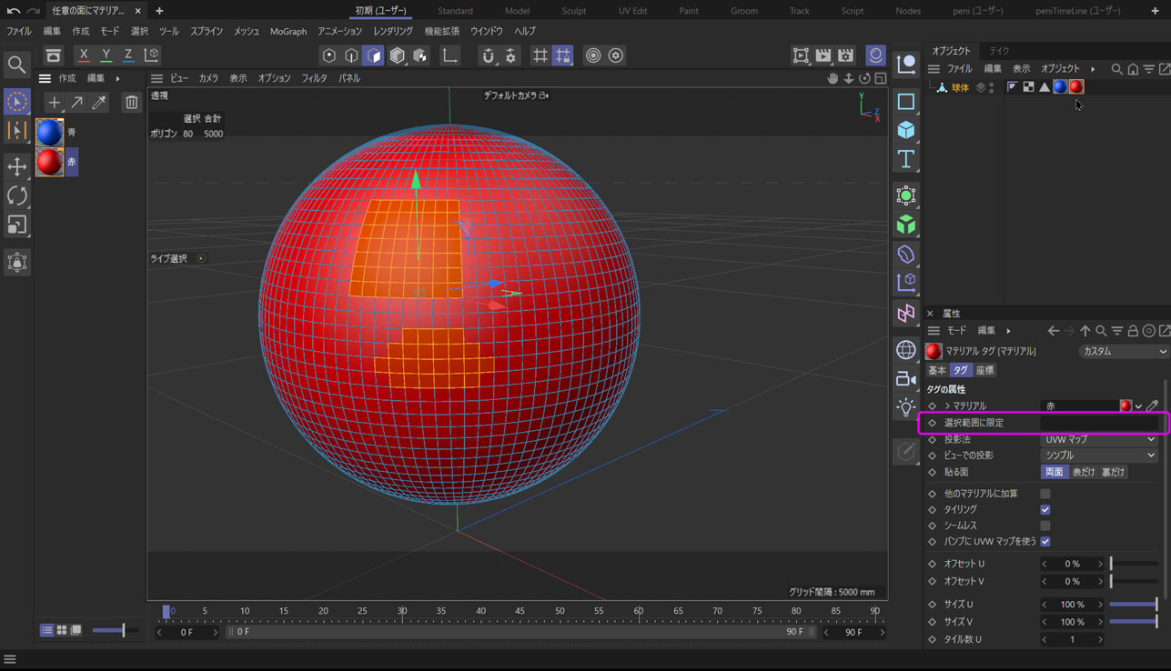 球体そのものは青色に、そして選択した部分だけは赤にしますので、青と赤のマテリアルを一つのオブジェクトに適用します。