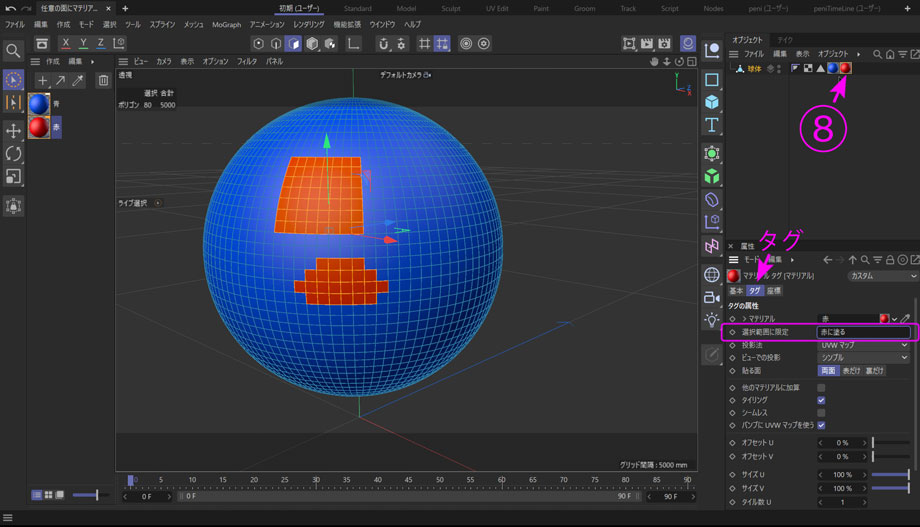 ⑧の赤色マテリアルタグをクリックしてから、属性マネージャの中にある【選択範囲に限定】の欄に『赤に塗る』と入力して、この名前が付いた選択範囲を指定します。すると上の写真のように、その部分だけに赤色のマテリアルが貼られました。