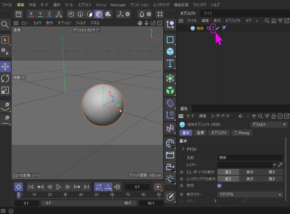 もしどこか別のところをクリックしてしまって、属性マネージャが別のものに切り替わってしまったときは、もういちど ④のタグをクリックすれば先ほどの状態に戻ることを覚えておいてください。