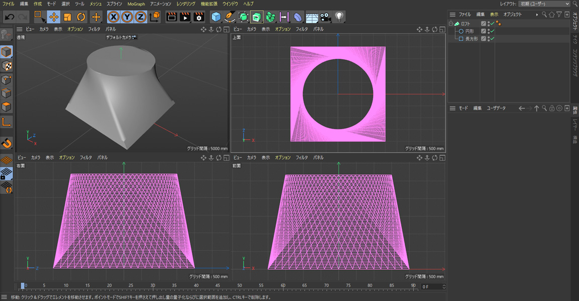 写真は、底面を正方形、上面が円のスプラインオブジェクトへ、ジェネレータの【ロフト】を適用したものです。正方形から 円までをスムーズに繋いだ立体物ができ上っています。