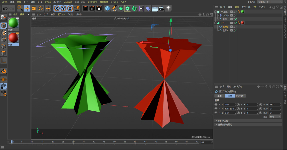 緑色のオブジェクトは星形をジェネレーターの【押し出し】で押し出して立体物にしたものに、デフォーマの【ツイスト】を掛けて 360°捻じっています。