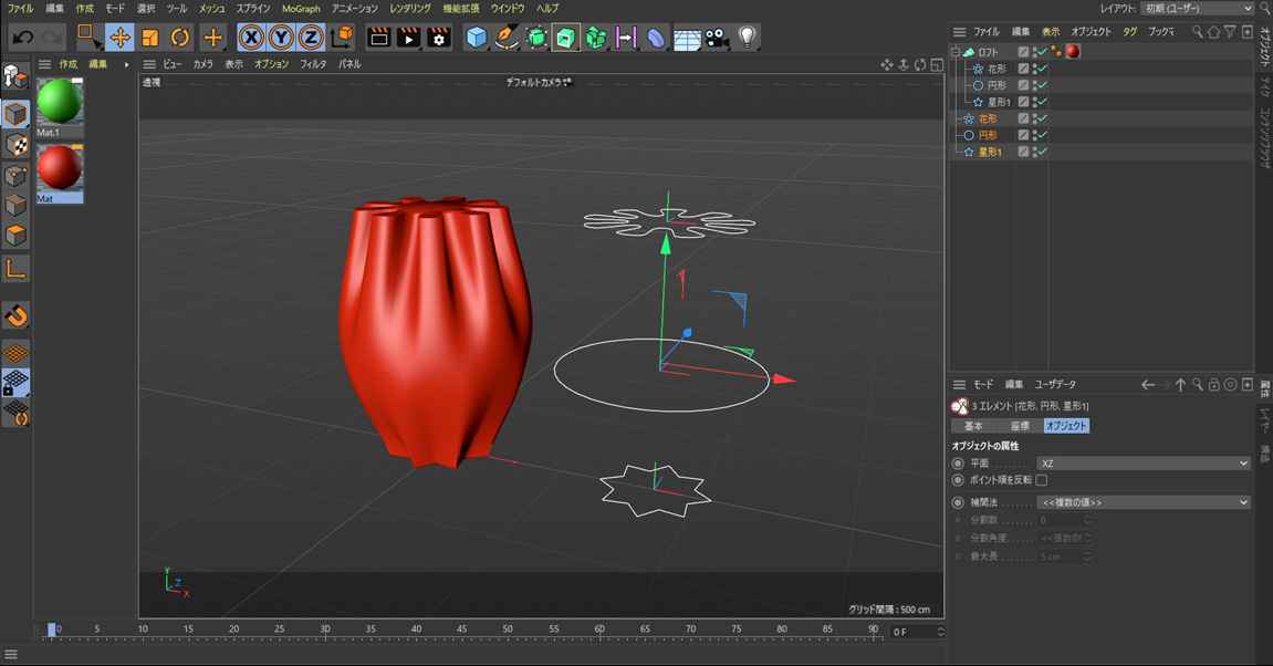 この立体物に使用されているスプラインオブジェクトと同じものを右隣に置いてあります。最も下が【星形】で、真ん中が【円形】、そして天辺が【花形】です。きれいにつながっています。