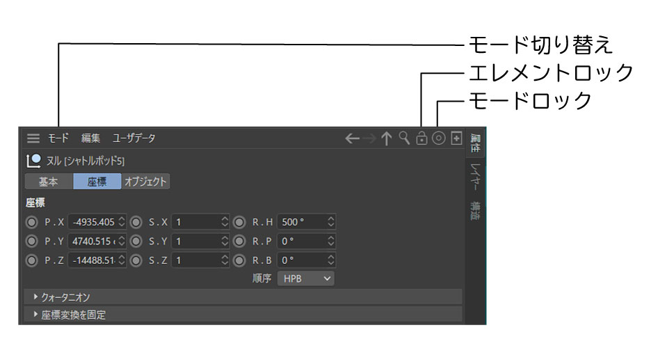 目的の情報が切り替わってしまったら【モード】切り替えボタンを押せば、リストがずらっと並びます。オブジェクトの【座標】入力に戻りたければ【モード】→【オブジェクト】です。タイムラインのキーフレームの属性に戻りければ【モード】→【タイムライン】で元に戻ります。