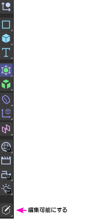 他にも写真のピンク矢印のアイコンを押してもオブジェクトが編集可能状態になります。