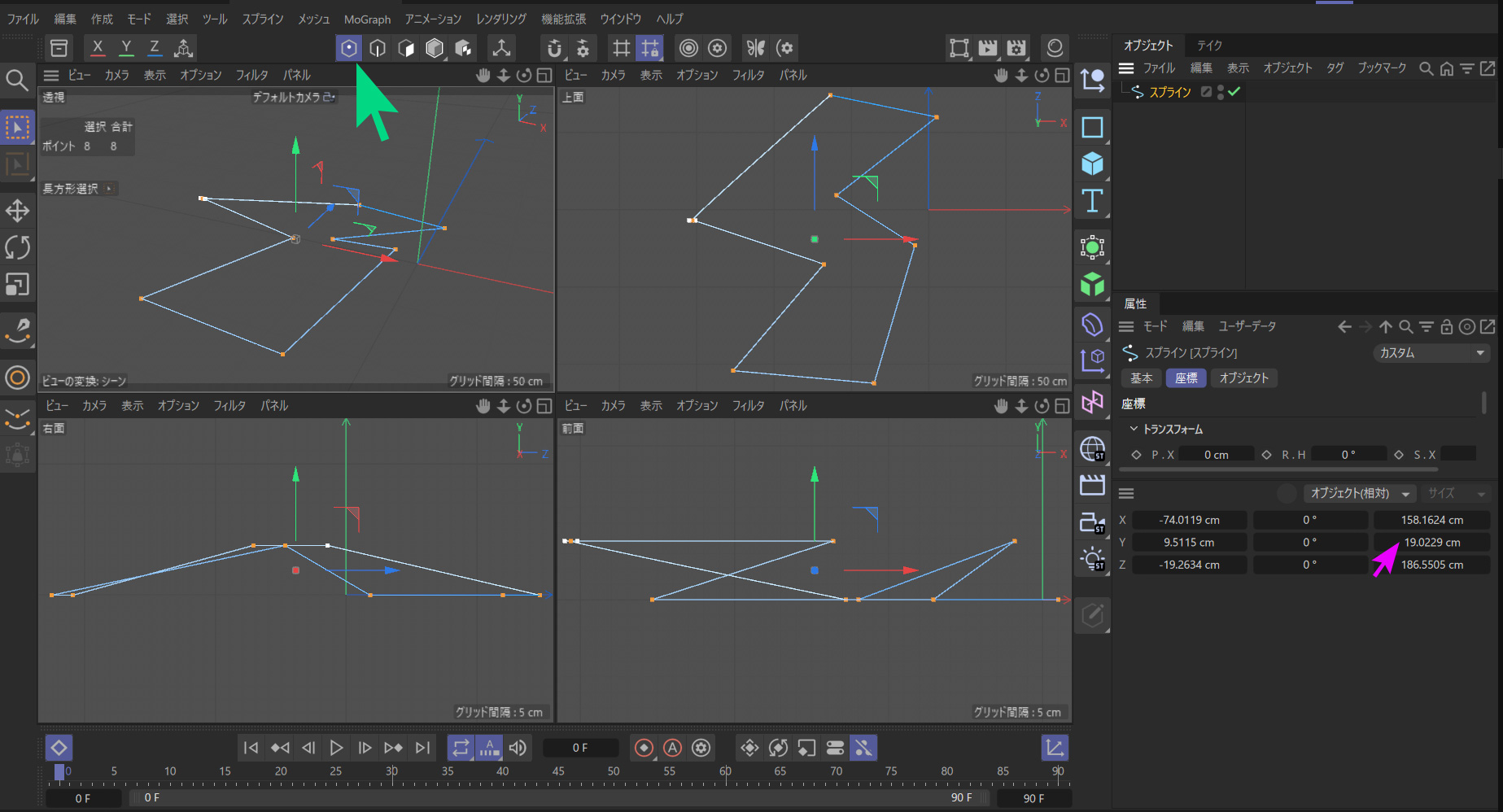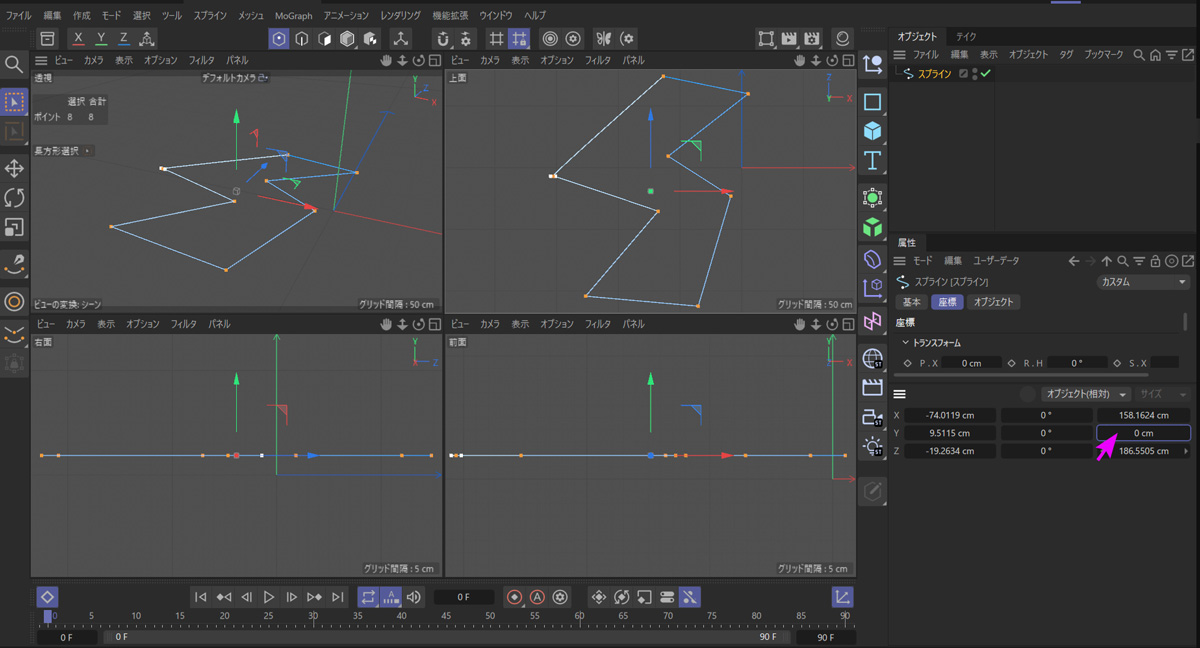 ピンク矢印のYの値が『19.0229cm』となっているのは、Y方向に 19.0229cmの値が存在するということで、もし真っ平らな平面でしたら Yの値は『0』にならないといけません。数値があるということは、この閉じたスプラインはどこかのポイントが上方向にズレていることを現しています。