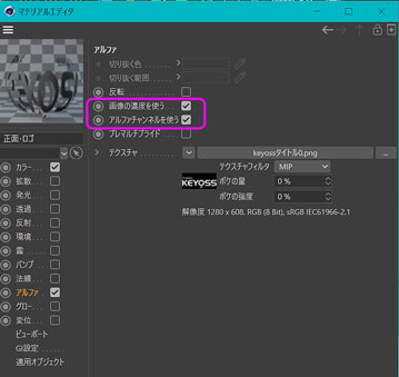 読み込んだらアルファチャンネルの設定にある【画像の濃度を使う】と【アルファチャンネルを使う】にチェックを入れます。