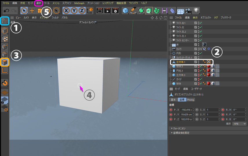 今回のように単純な立方体だとそれほど面分割を意識しませんが、複雑なものになるとかなりの分割を強いられることもあります。するとポリゴンの選択がとても難しくなります。そこで C4dではいろいろな方法が準備されています。