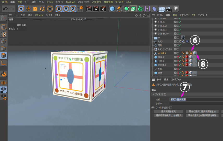 選択範囲が記録されると、⑥の位置に『ポリゴン選択範囲タグ』が追加されますのでそれをクリック。