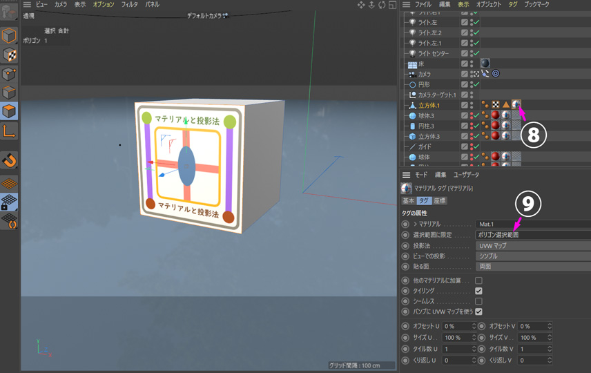 続いて③のポリゴン(面)モードにして、貼り付けたい面を選択。写真では面分割を 1面のままにしていますので、上下左右と手前と奥の面の 6面です。