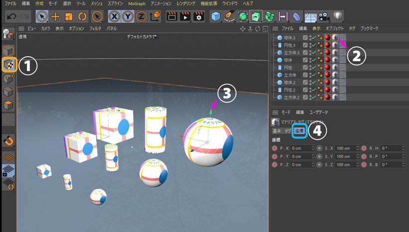 その2:オブジェクトの形状によって、マテリアルがどう貼られるか。(ネットの説明通りです)