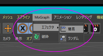 すると、一つのツールが追加されました。【破砕】と呼ばれる一つのモーグラフと【エフェクタ】と呼ばれる中には二つの【簡易】と【ランダム】が。