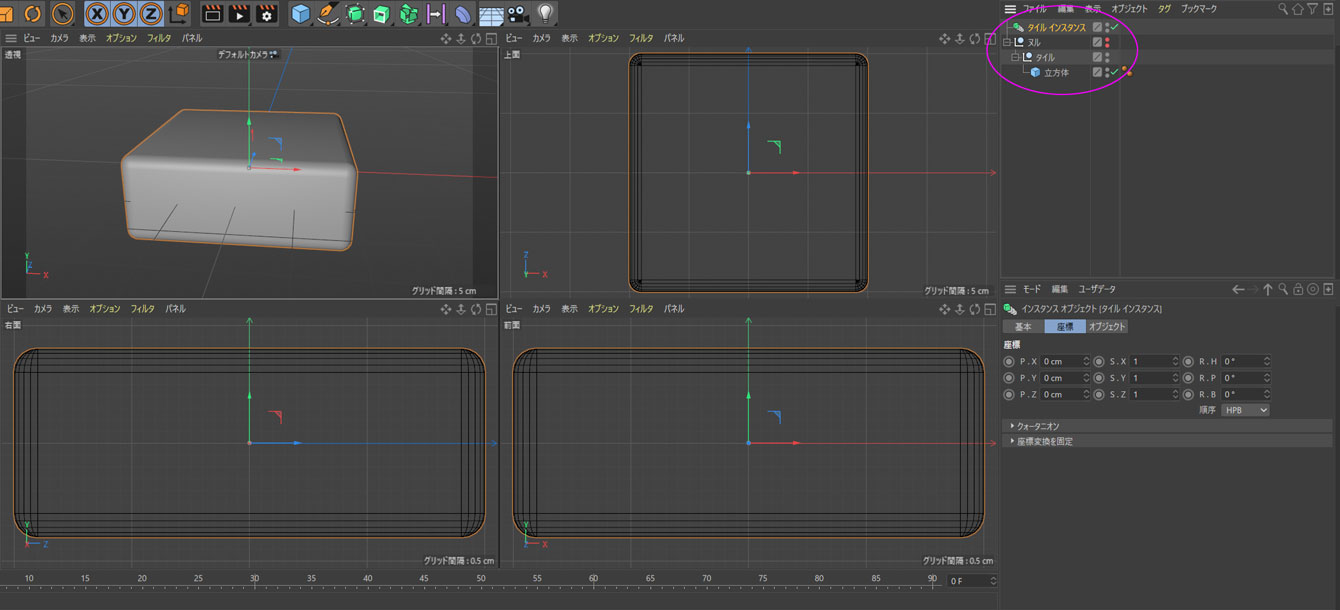 まずタイルを1個作ります。あとで調整する必要ができた時のために、インスタンス化します。インスタンスについてはこちらの 【 ジェネレータの【インスタンス】オブジェクトってなんだ?】をご覧ください。
