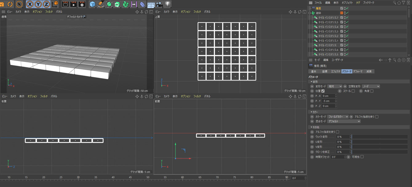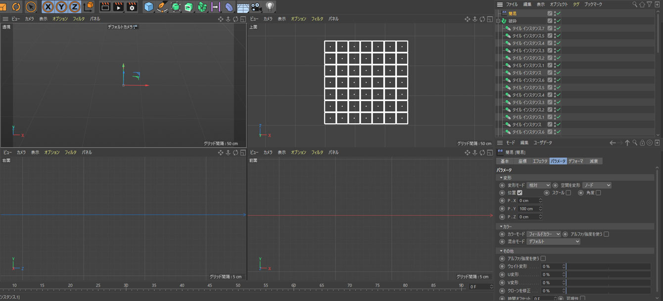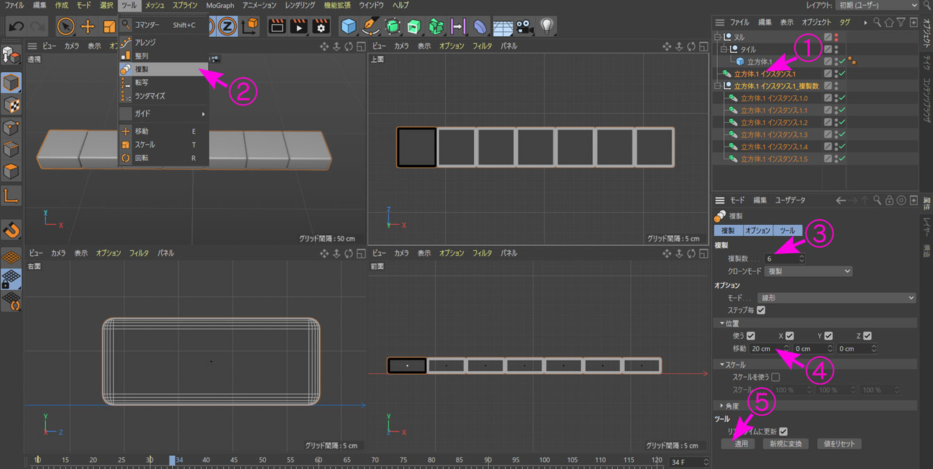 作ったインスタンスを選択してから、ウインドウメニューの【ツール】→【複製】を押して属性マネージャに出たパラメータ類を写真のようにして適用ボタンを押すと、横に 6個のタイルができ上ります。