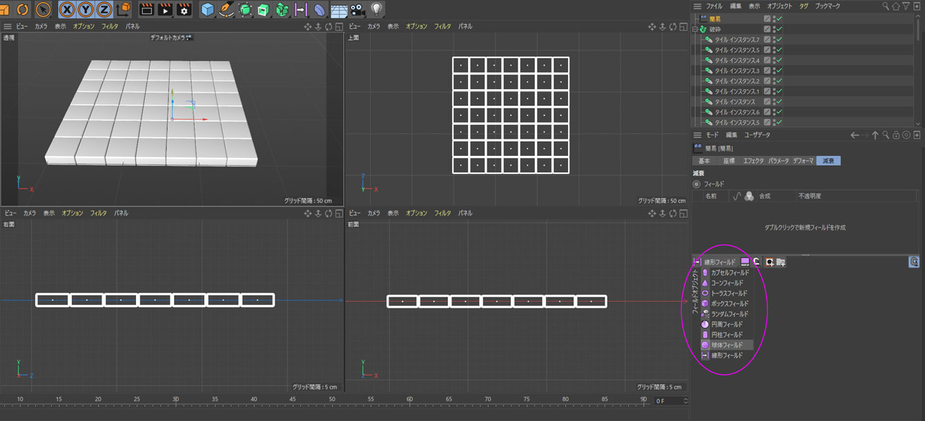 まず、【破砕】の下層に動かすオブジェクトをいくつか置いてから、【エフェクタ】の【簡易】を適用、さらに【簡易】の【減衰】から【線形フィールド】を採用します。ここまでは【球体フィールド】のときと同じです。