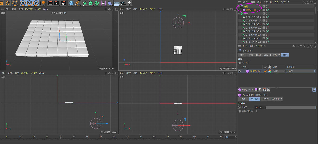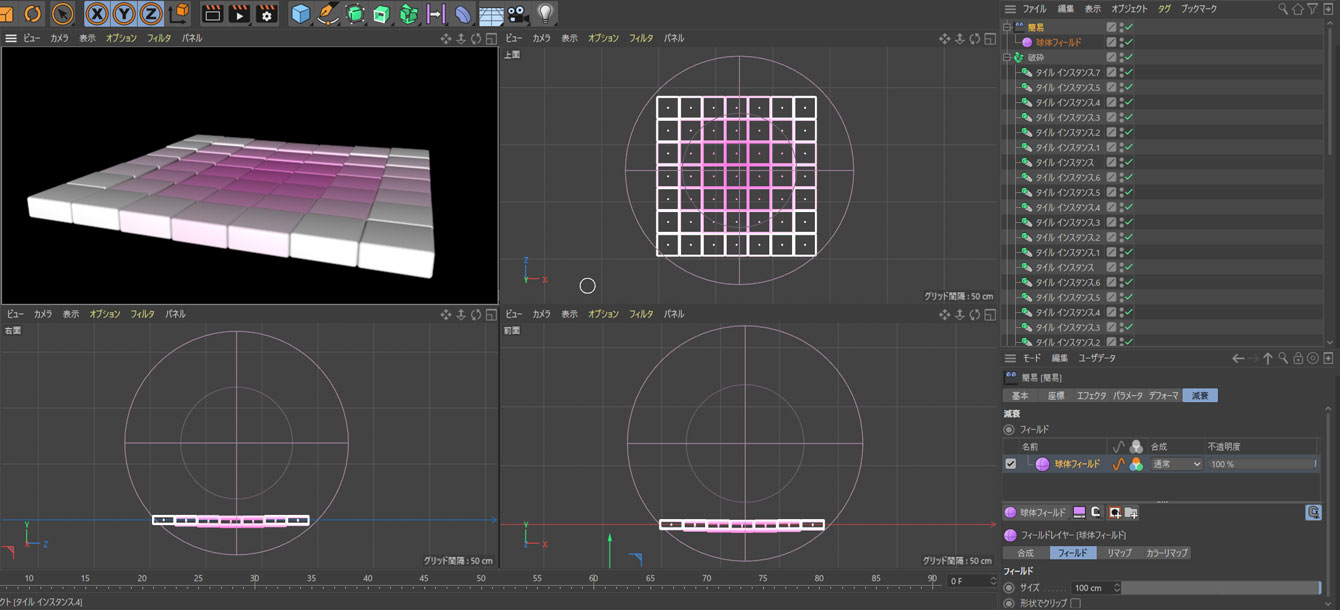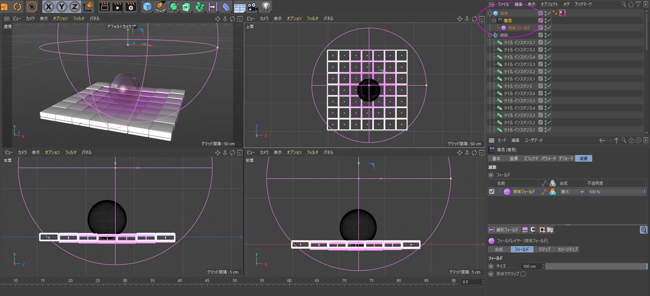 [3] エンベロープを決めるのが、エフェクタの【簡易】で、その中にある【減衰】でエンベロープの形を決めます。今回は球体がタイルを押しますので、『球体フィールド』を選びました。