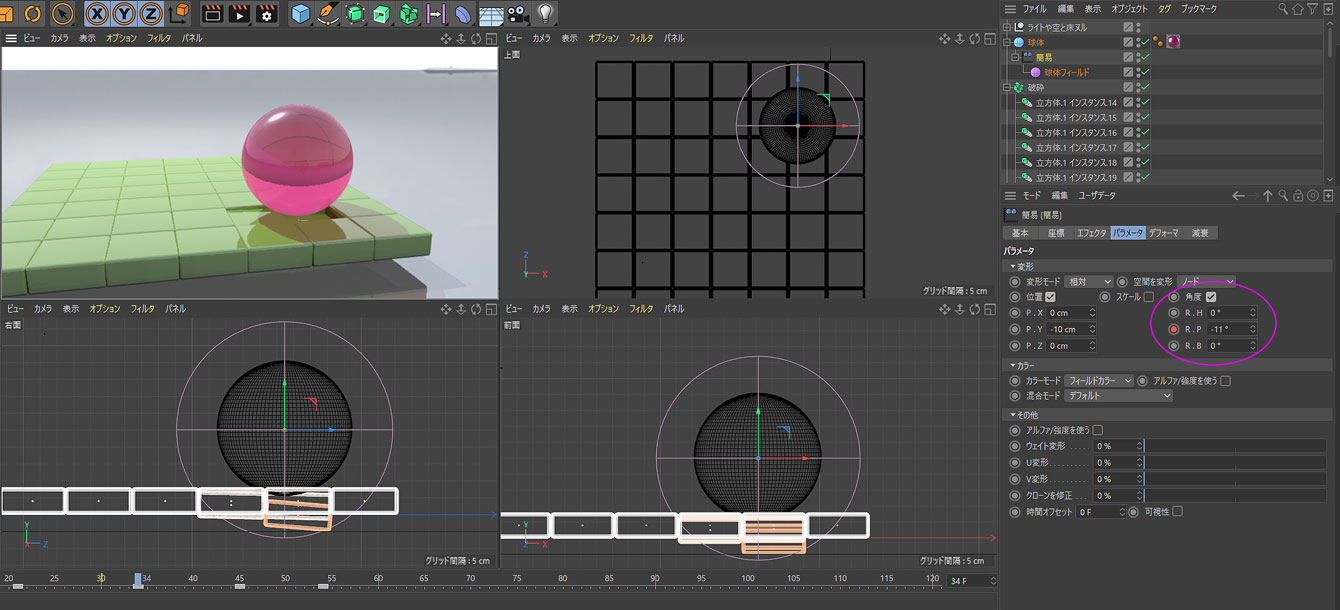 [5] 球体オブジェクトの子階層に【簡易】オブジェクトを入れて【球体フィールド】ともに球体の中心に軸を合わせます。