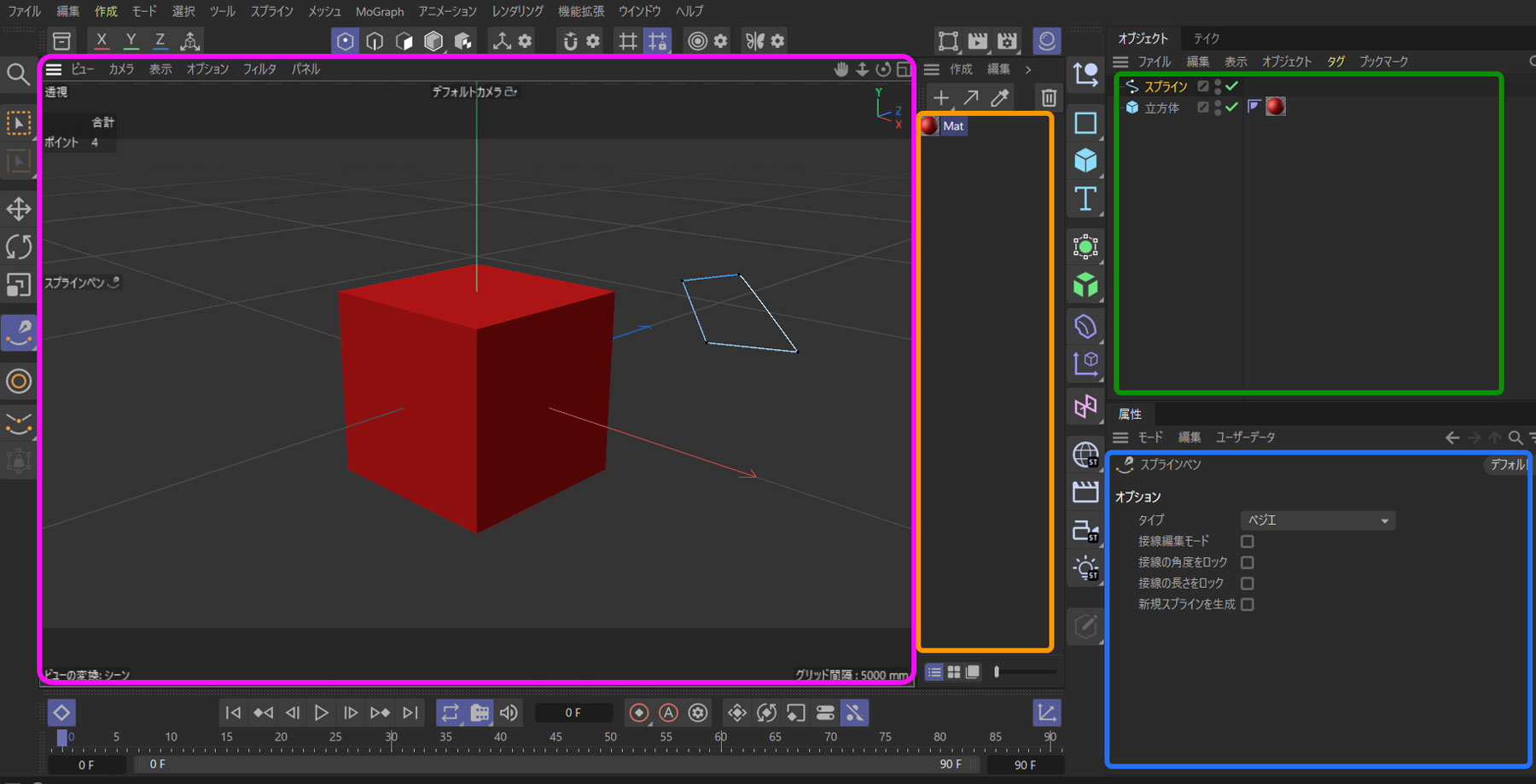 AEでいうところのコンポジションウインドウです。前回でも述べましたが、3D特有の 4面ビューにするのなら、ピンク枠のウインドウメニューの最も右端のアイコンがそれです。
