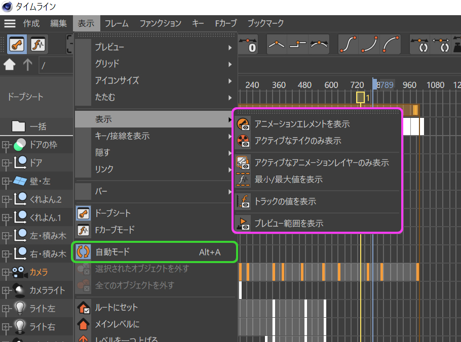 このままではアニメーションに関係ないオブジェクトまでトラックに表示されますので、【表示】→【表示】→【アニメーションエレメント】をオンにします。するとキーフレームを打ったオブジェクトだけがすべて並びます。また【表示】→【リンク】の項目も機能しますので注意してください。