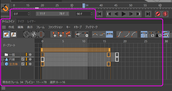 タイムラインのすぐ上にある [0F]と書かれた入力フィールドと [90F]と書かれた入力フィールドに挟まれた [11F 78F]とある伸縮バーの右側、あるいは左側をマウスドラッグして伸ばしたり縮めたり、あるいはセンターをドラッグして移動させると、下のタイムラインの表示範囲が同期して伸び縮み、あるいは表示位置の移動ができます。この機能をオン、オフするのが、【表示】→【リンク】の【表示とプレビューをリンク】になります。オンにするとドラッグに応じてタイムラインの表示範囲が変化します。