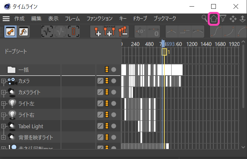一括トラックというのはタイムラインのトラック表示エリアの最も上段にある『一括』と書かれたトラックに並ぶキーフレームで、これを選択するとそのフレームにあるすべてのキーフレームを選択したのと同じ扱いになります。全体移動などの場合に大変便利ですが、間違ってすべてが動いてしまうという事故にもなります。