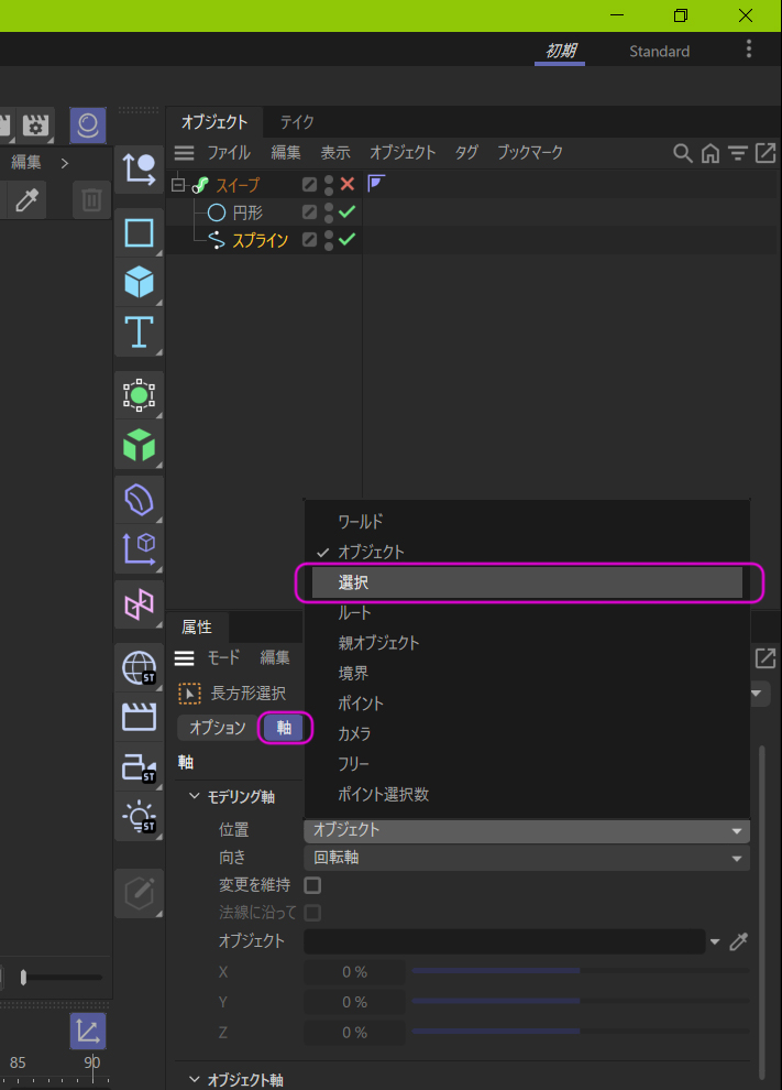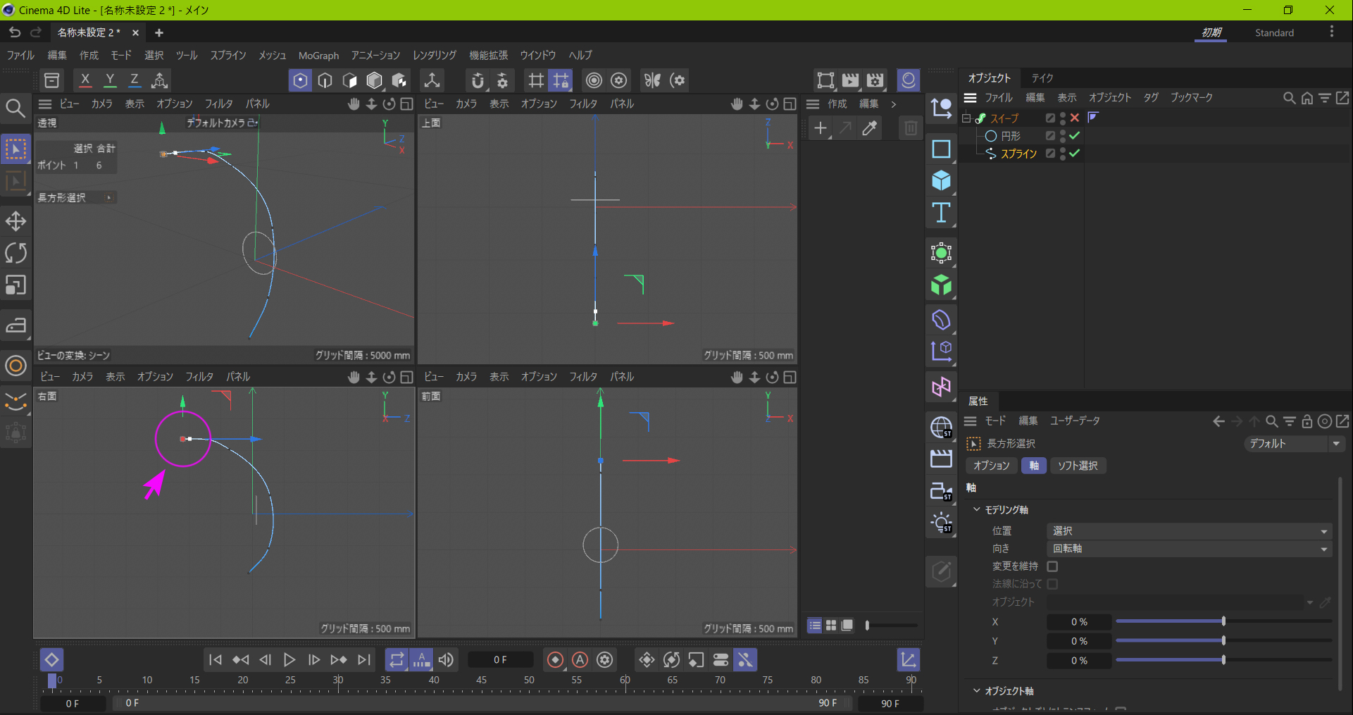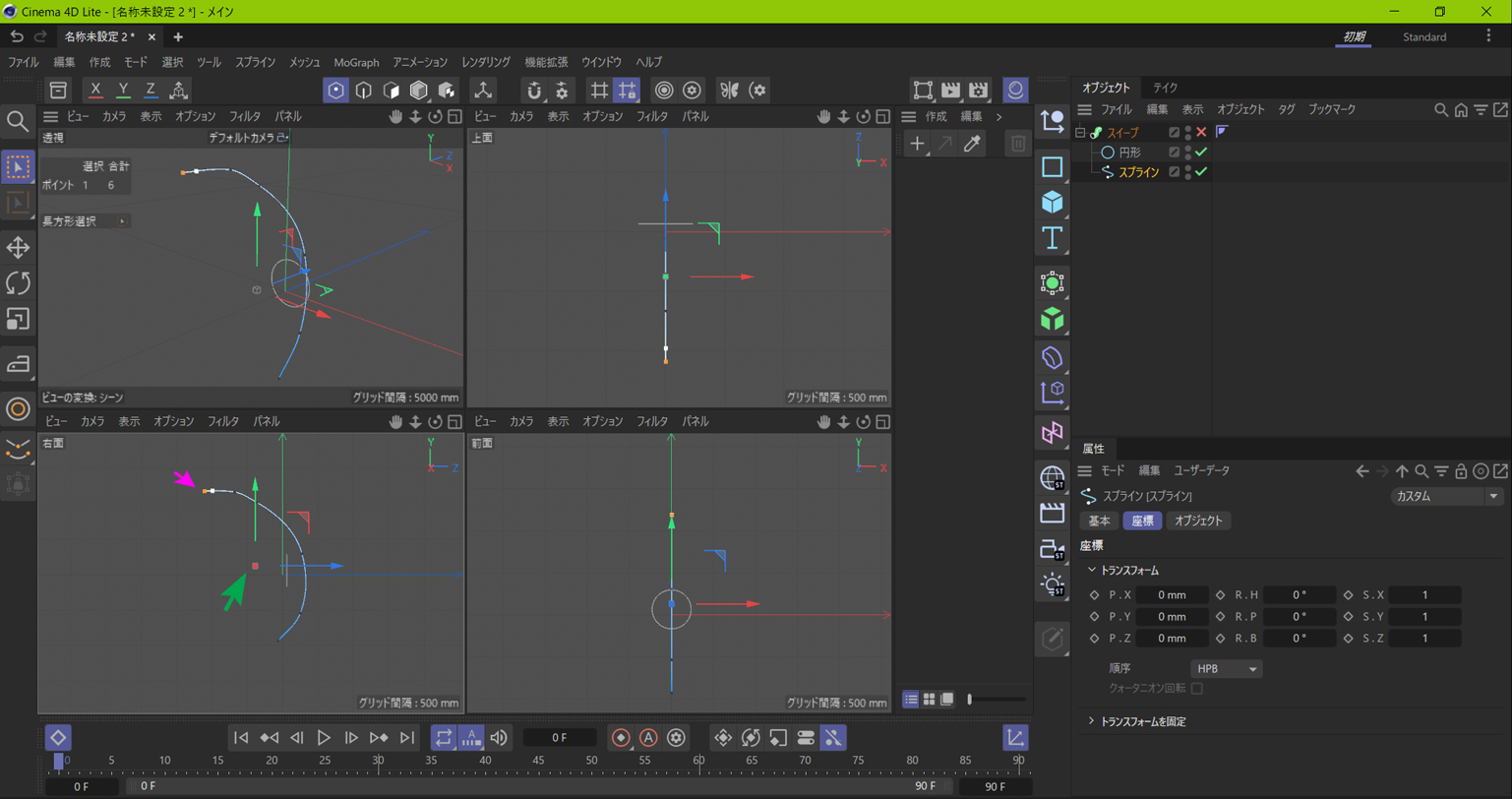 この写真は、スプラインと円形オブジェクトをスイープさせようとしているところです。分かりやすくするためにスイープは機能していません(オブジェクトマネージャのスイープを×にして止めています)