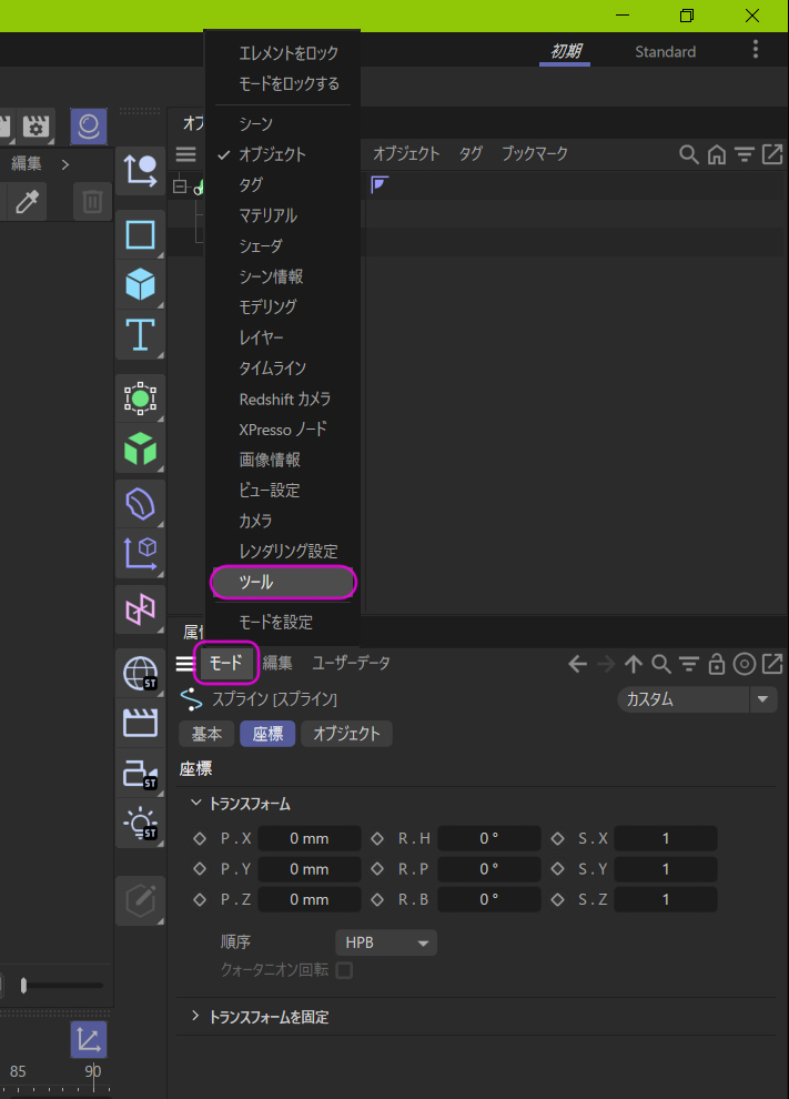 まず、オブジェクトマネージャのスプラインの項目を選択してください。これをしないとまったく無意味です。初めのうちはパネルやアイコンの多さに圧倒されて、何が何だかわからないまま進んでいきますので、体に焼き付くまで反復練習です。