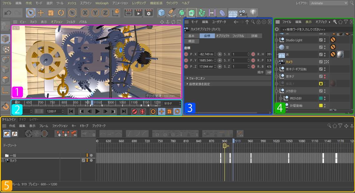 キーフレームを打ったオブジェクトがエディタビューに2~3個並びだすと気付くと思います。デフォルトでは [4] オブジェクトマネージャ(OM)から[5] メインタイムラインへは連携していて、OMでオブジェクトをクリックすると、[1] エディタビューのオブジェクトとタイムラインのオブジェクトがフォーカスされます。でも反対にタイムラインのオブジェクトをクリックしても、エディタビューや OMにはフォーカスされないことを。