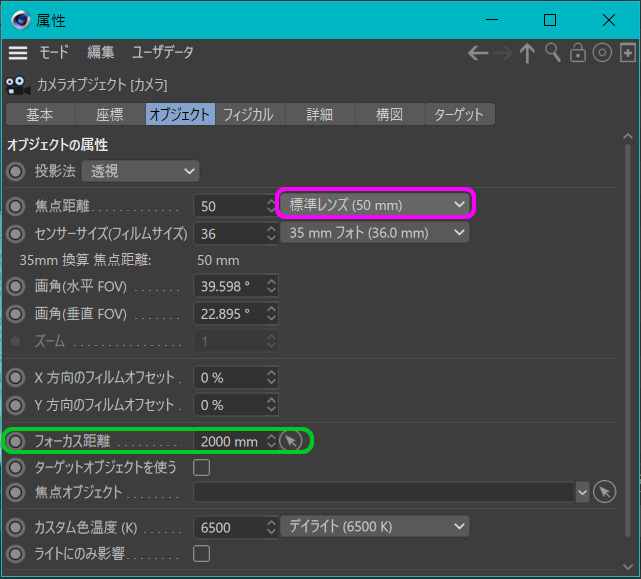 ワタシが使うのはいつも標準レンズの 50mmです。一番上のツールアイコンからライトの左にあるカメラをクリック。設定は属性マネージャのここです。