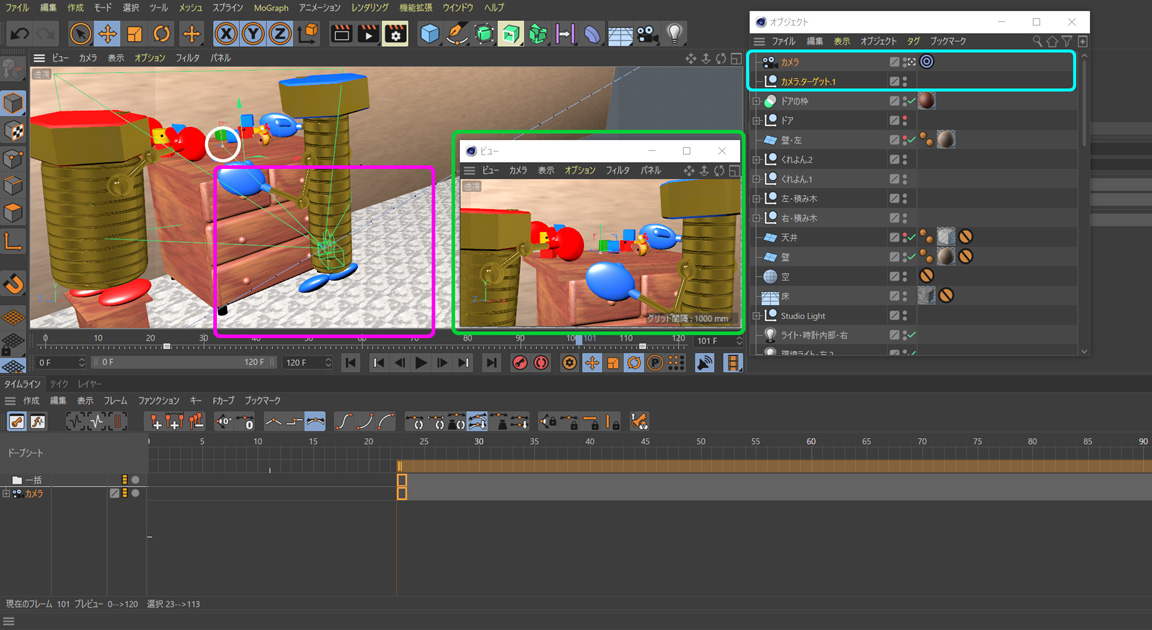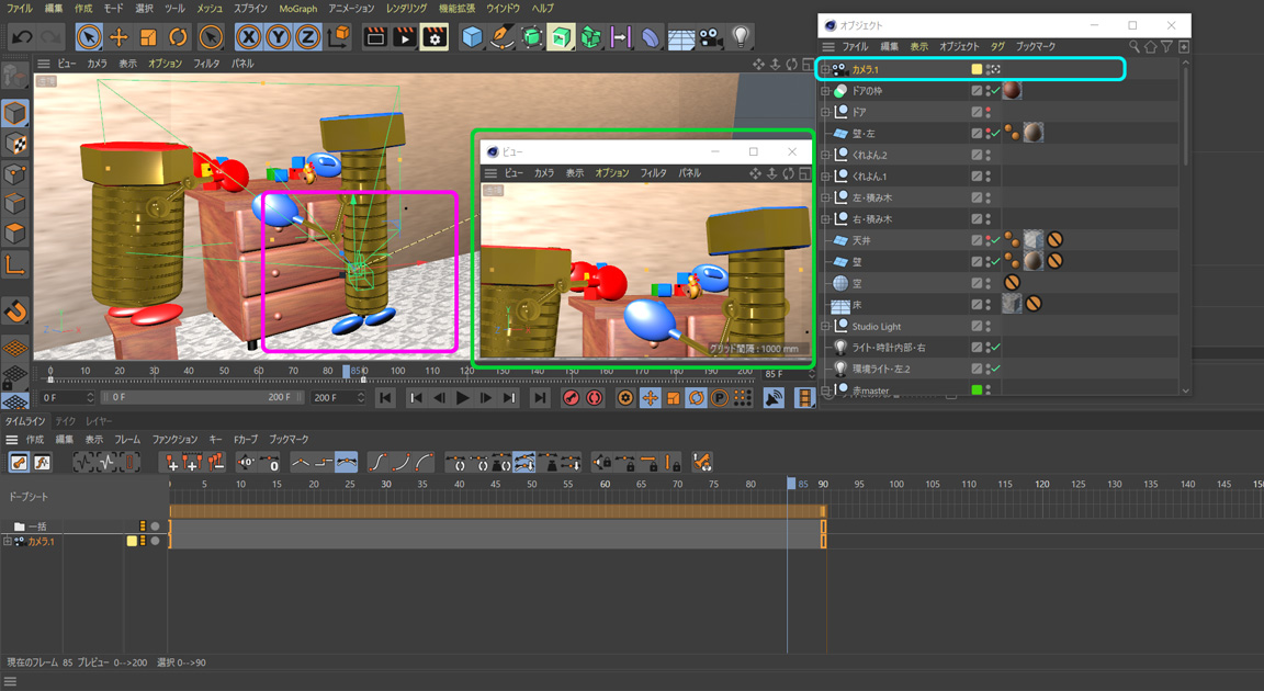 ここで注目してもらいたいのは、いつものエディタビュー以外に、緑枠で囲いましたが、もう一つ新しいビューが出ていることです。この中の映像は設置したカメラが捉えた映像です。ワタシはカメラワークをするときは、このビューを見ながらエディタビューのカメラオブジェクトを動かして、カメラアングルを決めています。エディタビューはあちこちに向きを動かしますが、カメラビューは決して触りません。見るだけです。