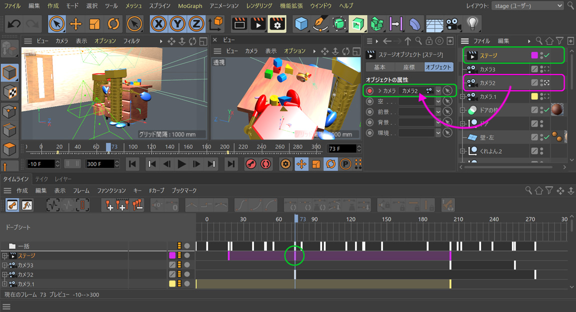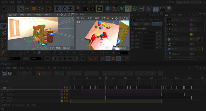 正式な方法でカメラを切り替えるのなら、『ステージ』オブジェクトを使います。次の動画は『ステージ』オブジェクトで 3つのカメラを切り替えた映像です。