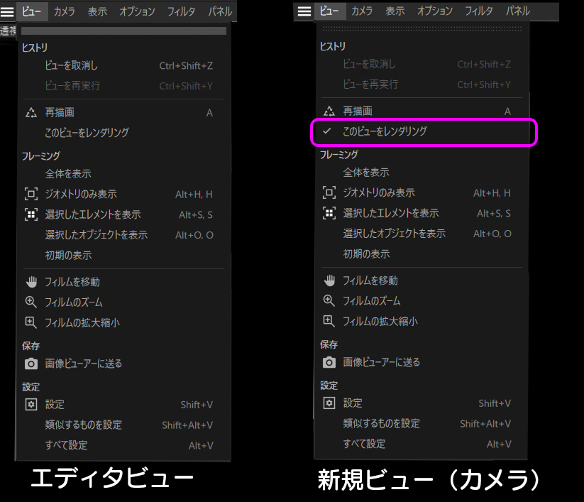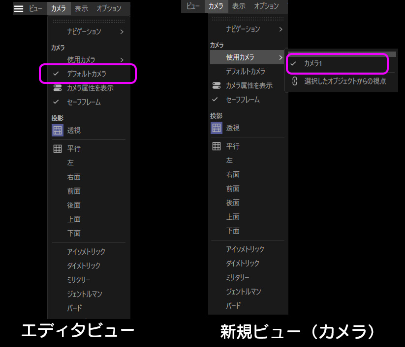 これはもとからあるエディタビューと、追加した新規ビュー(カメラ用のビュー)のウインドウメニューにある【ビュー】設定をそれぞれ開いた2枚の写真です。
