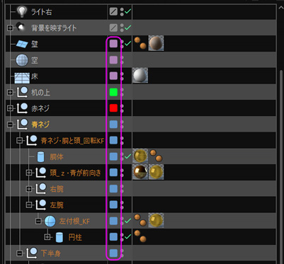 その中で、ピンク枠で囲った部分がレイヤータグと呼ばれる部分で、色が付いているのはそのオブジェクトがその色のレイヤーに登録されているからです。レイヤーは好きな色が使えて、それぞれ別のものとして扱われますが、同じ色はそのグループに入ります。
