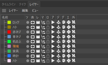 個々のレイヤーには各種の設定があります。その設定にすると所属するオブジェクトが従います。いくつもありますが、よく使うのは AEでもおなじみの、可視と不可視の切り替え、ソロ(単独)のオンとオフ、ロックのオンとオフぐらいです。
