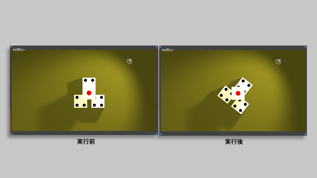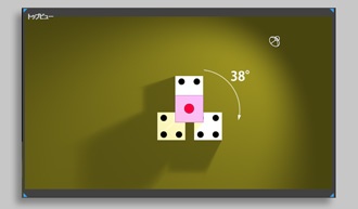 この 4つのサイコロオブジェクトのうち下 3つのサイコロをひと塊にして時計方向に 38°回転させてください。