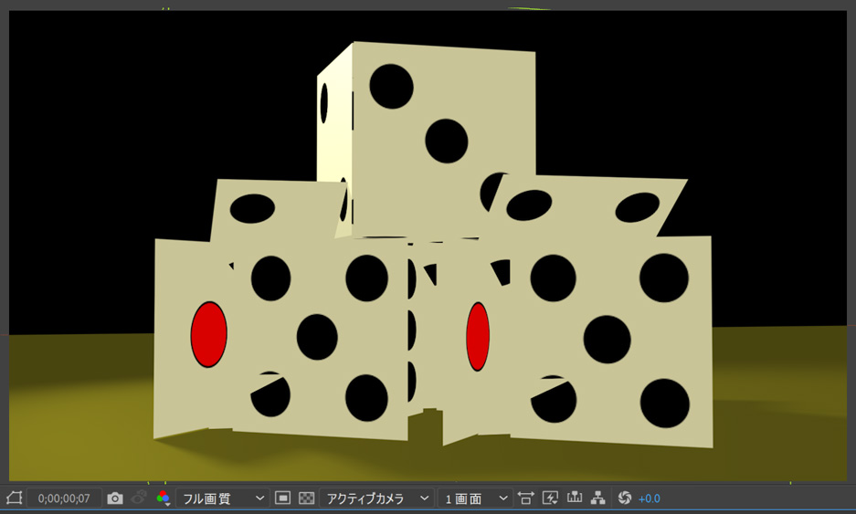 床の上に並べられた 3つのサイコロ。その上にもう一つのサイコロを重ねた 3Dを作ったとします。